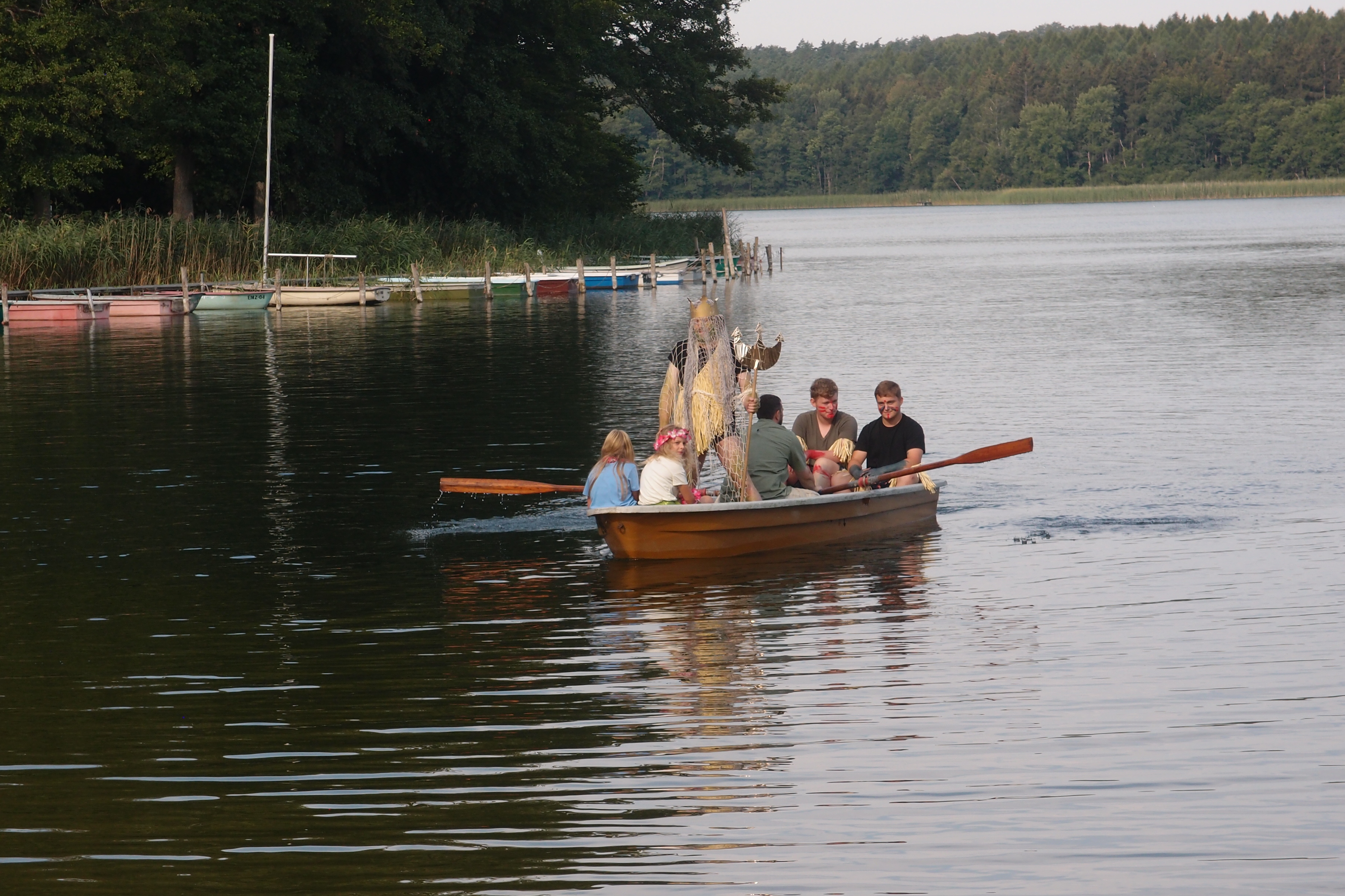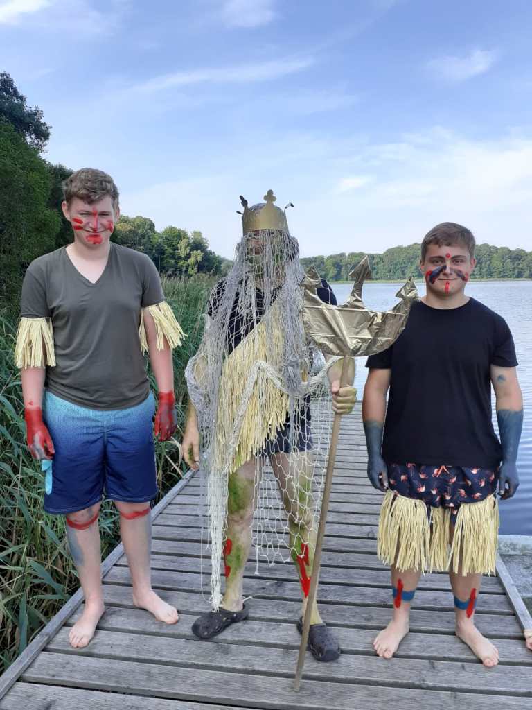 Heute war ein besonderer Tag. Wie schon die letzten Wochen auch, war wieder superschönes Wetter. Da macht das Lernen in der Schule in den heißen Räumen nicht so viel Spaß. Also machten wir uns auf den Weg, um Neptun, Herrscher aller Ozeane, Seen, Tümpel, Teiche und Pfützen um eine Abkühlung zu bitten. Und prompt erschien er mit samt seinem Gefolge. Einige Kinder und Lehrer hatte er zur Taufe auserwählt. Nicht alle waren mutig genug, um sich taufen zu lassen aber am Ende war es ein großartiges Erlebnis für alle. Beim gemeinsamen Baden hatten alle Kinder viel Spaß.