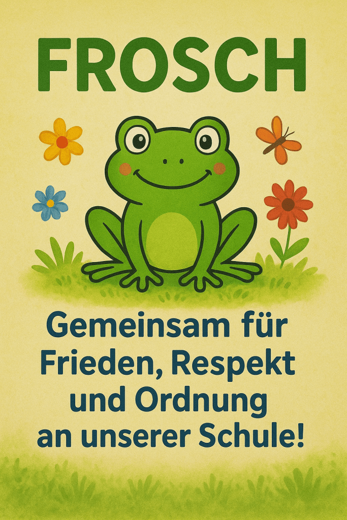 FROSCH steht für F- Frieden, R- Respekt, O- Ordnung, SCH- an unserer Schule. Es gibt 10 Gruppen: die FROSCH-Paten und FROSCH-Sekretäre, die ABC- und Hygiene-Frösche, die Daten- und Zappelfrösche, die Sprach- und Medienfrösche sowie die Sozialen und Kreativen Frösche.